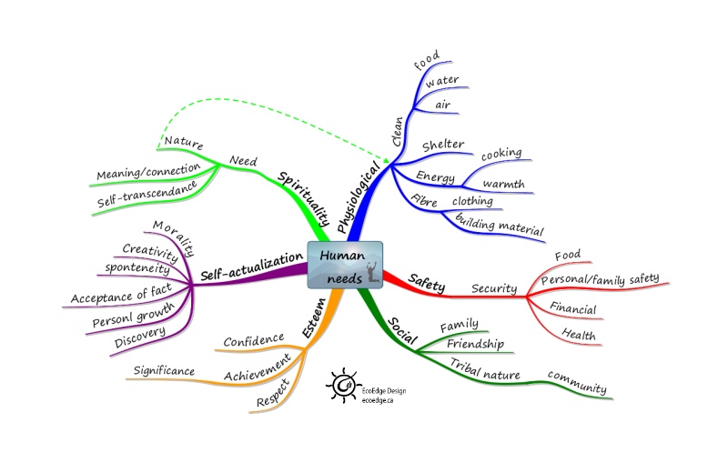 I mentioned at the start that permaculture is about meeting human needs, both tangible and intangible. Looking at this slide which I have based heavily on Maslow’s hierarchy of needs, we can go through point by point and ask how well the status quo system is doing at meeting those needs. Some are met, others are not. Almost none are met sustainably, which is where permaculture comes in.